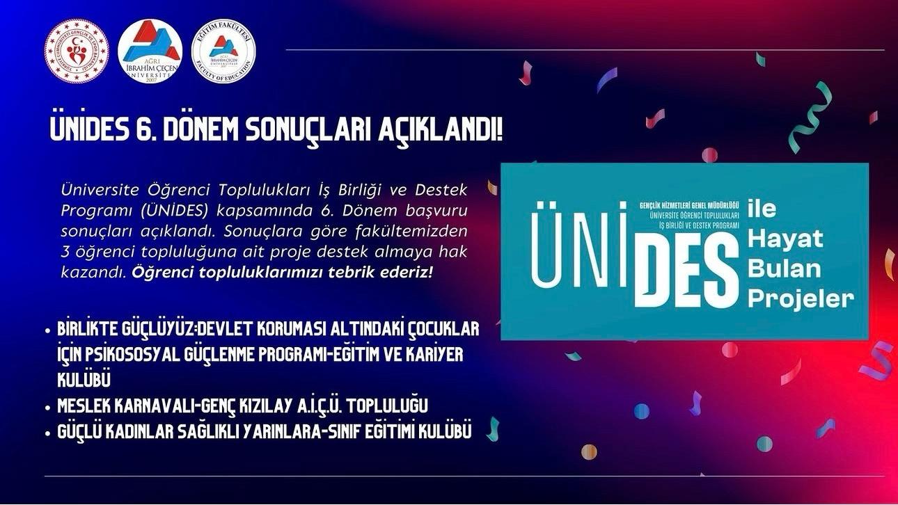 T.C. Gençlik ve Spor Bakanlığı bünyesindeki Gençlik Hizmetleri Genel Müdürlüğü tarafından yürütülen Üniversite Öğrenci Toplulukları İş Birliği ve Destek Programı (ÜNİDES) 6. Dönem başvuru sonuçları açıklandı.