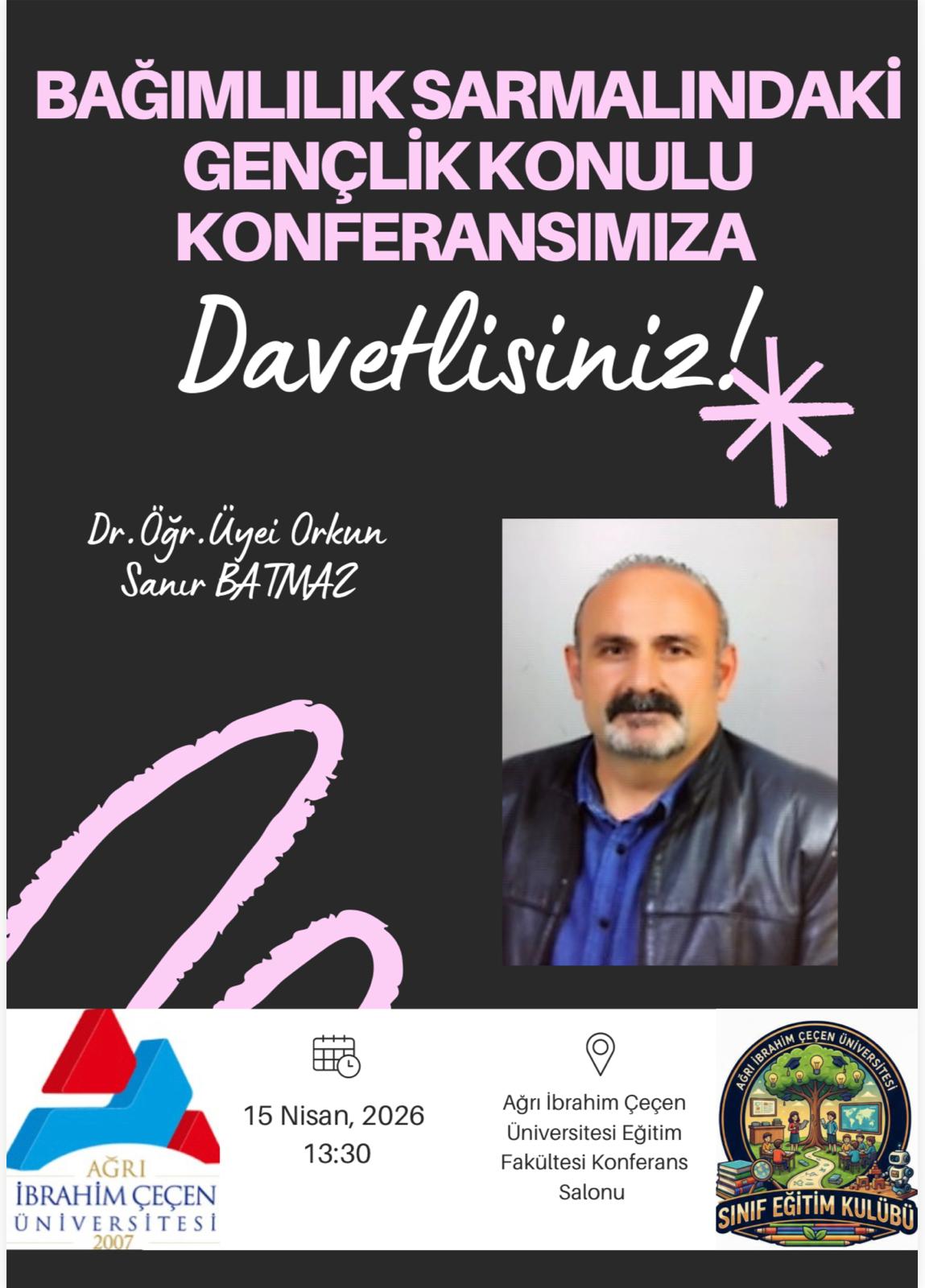 Eğitim Fakültesi Sınıf Eğitimi Kulübü tarafından düzenlenen “Bağımlılık Sarmalındaki Gençlik” konulu konferans, Dr. Öğr. Üyesi Orkun Sanır Batmaz’ın katılımıyla gerçekleştirilecektir.