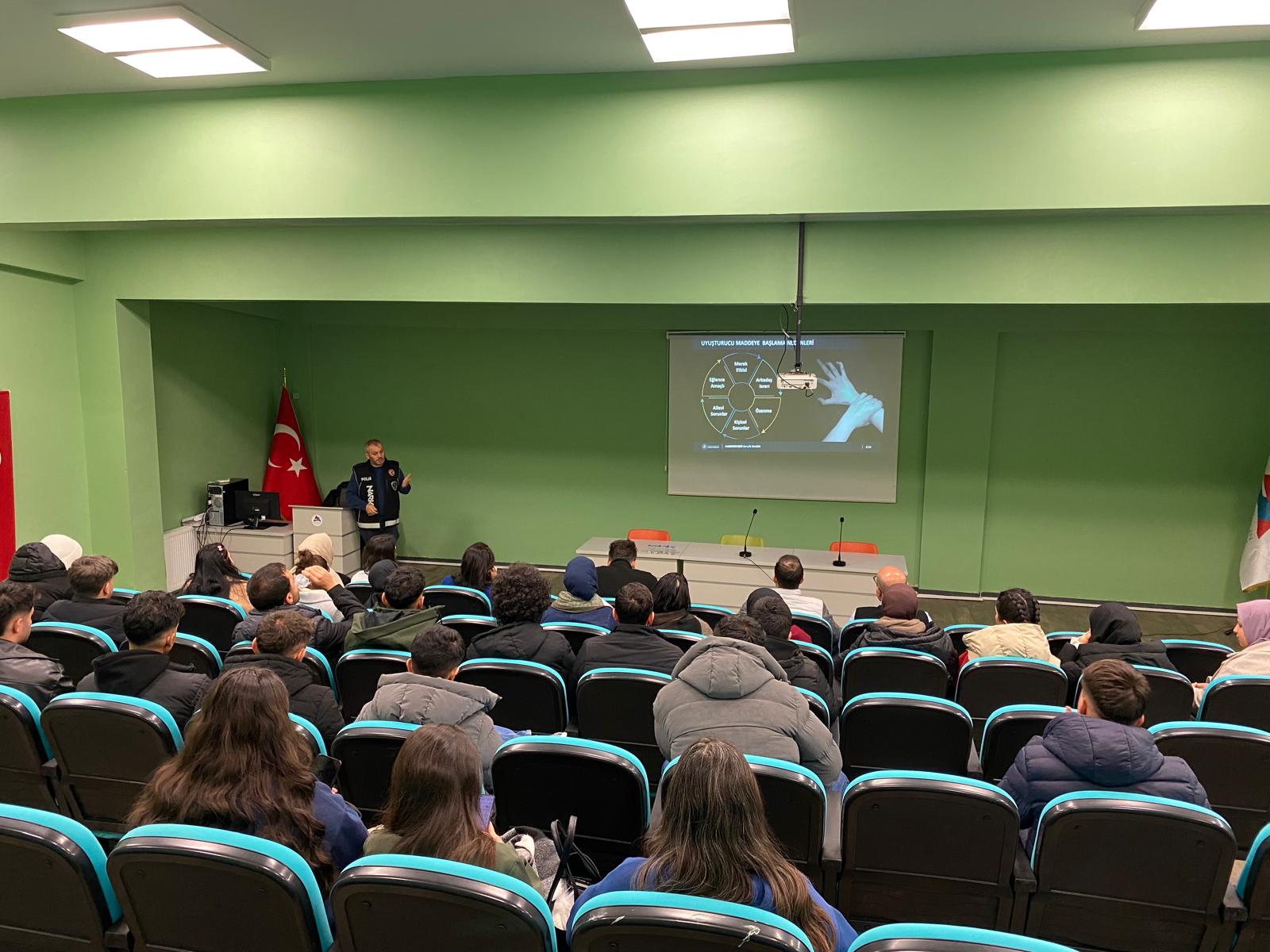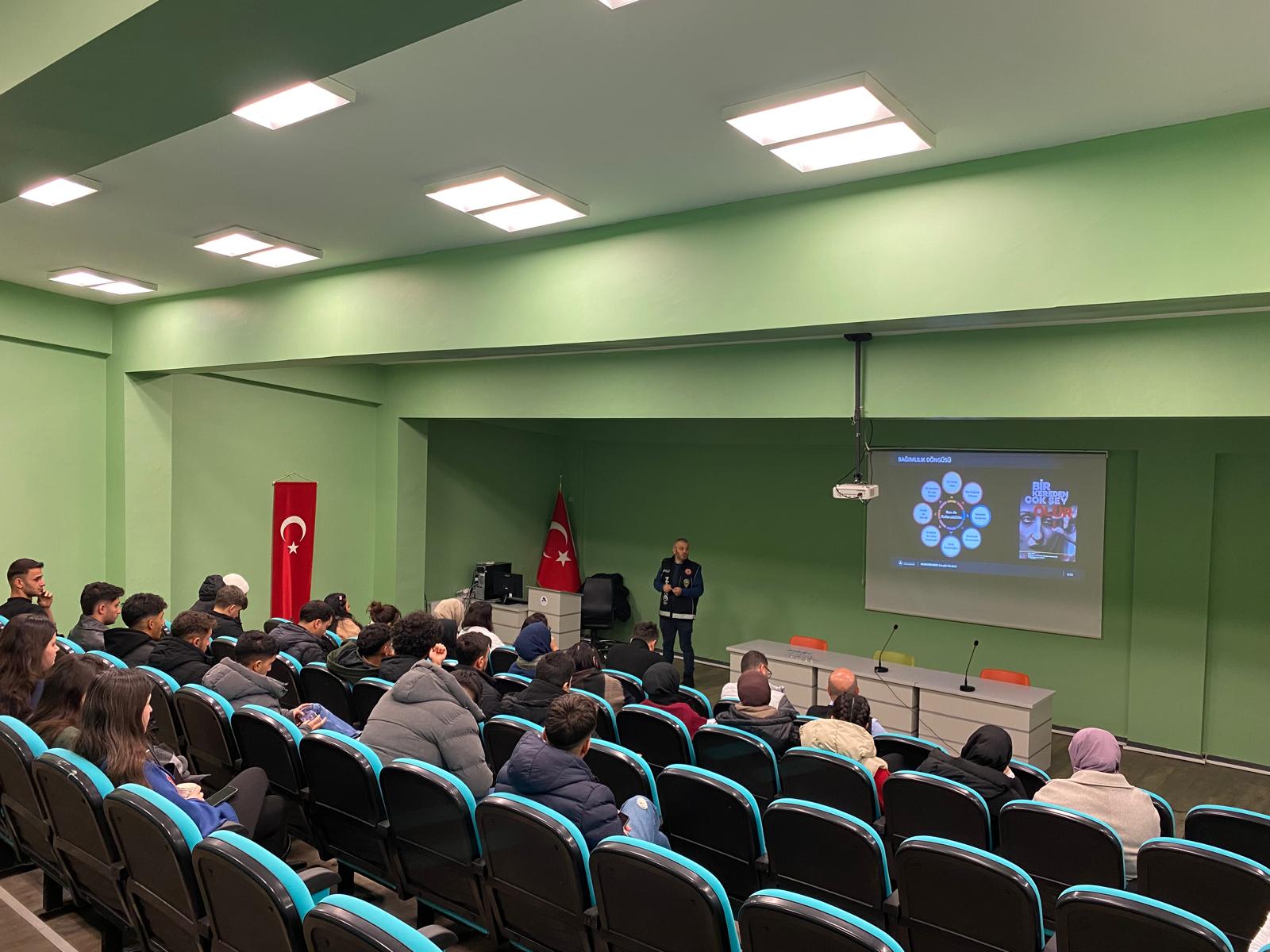 Yüksekokul konferans salonumuzda düzenlenen seminerde; Narkotik suçlarla mücadelenin önemi, yasaklı maddeye başlama nedenleri, bağımlılık başlangıcı ve bağımlılık döngüsünün nasıl oluştuğu, narkotik maddelerin sınıflandırılması, madde bağımlılığına giden yolun nasıl oluştuğu, madde kullanım belirtilerinin neler olduğu (fiziksel/sosyal belirtiler), yasaklı madde kullanımının yasal durumu ve sosyal sonuçlarının neler olduğu, yasaklı madde mücadele uygulaması (UYUMA), madde kullanımı ve bağımlılığı mücadele merkezleri hakkında bilgilendirmeler yapılıp, video gösterimi gerçekleştirildi.
