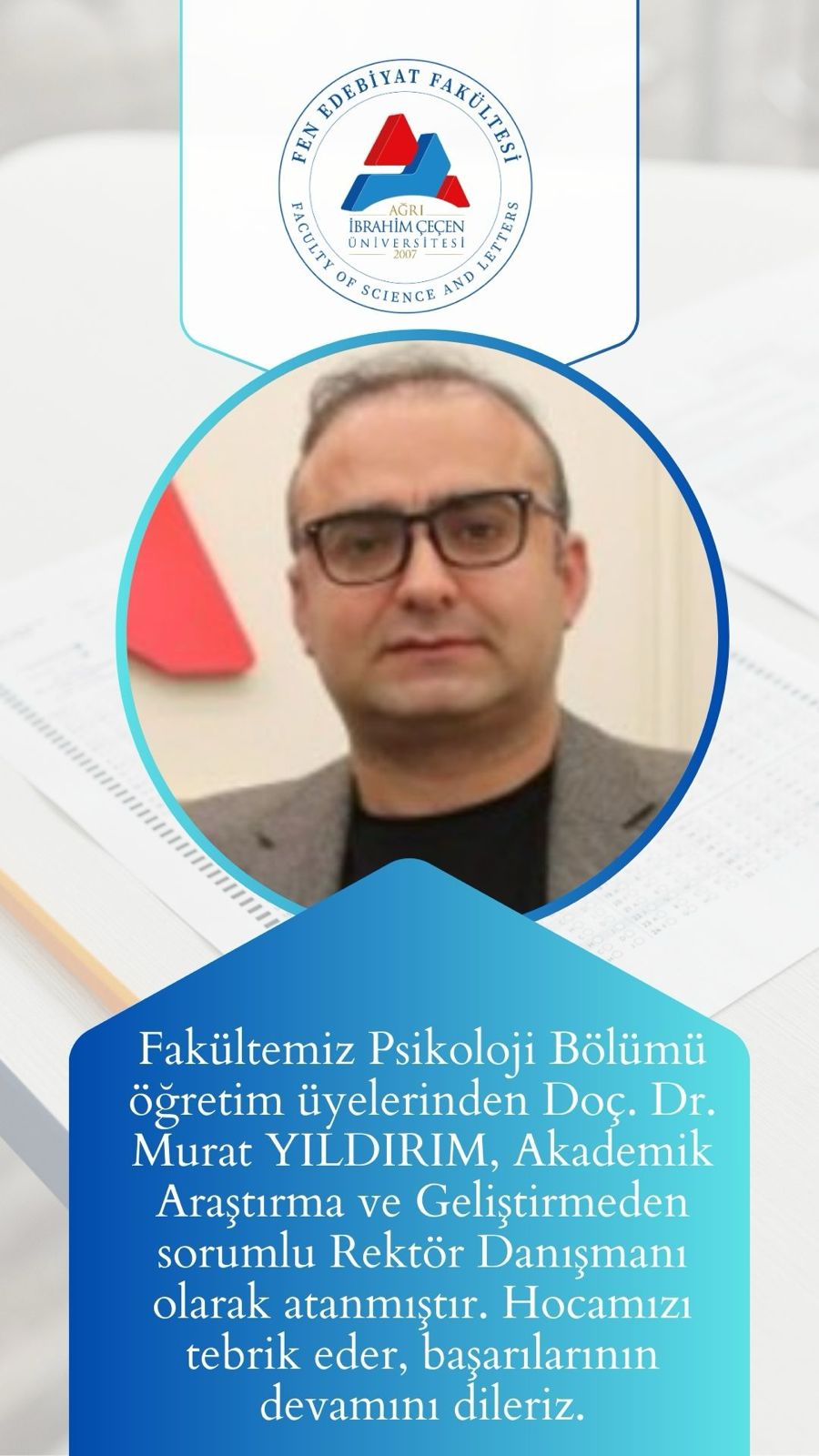 Fakültemiz Psikoloji Bölümü Öğretim Üyelerinden Doç. Dr. Murat YILDIRIM, Akademik Araştırma ve Geliştirmeden Sorumlu Rektör Danışmanı Atanmıştır
