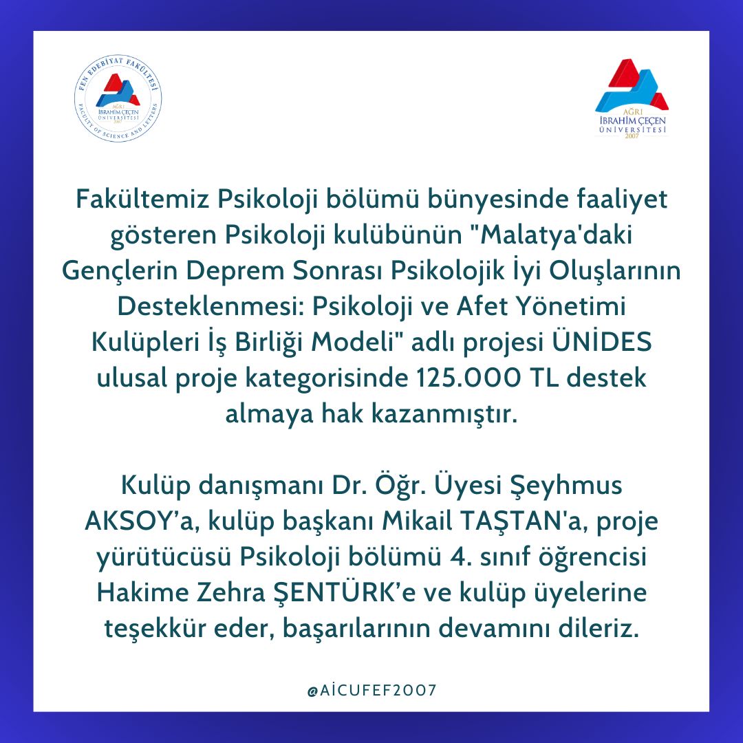 Fakültemiz Psikoloji bölümü Bünyesinde Faaliyet Gösteren Psikoloji Kulübünün Projesi ÜNİDES Ulusal Proje Kategorisinde Destek Almaya Hak Kazanmıştır.