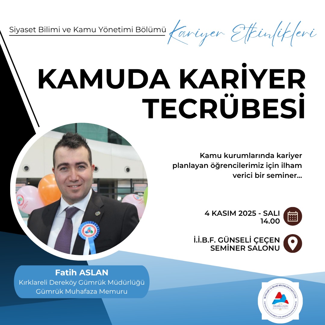 Siyaset Bilimi ve Kamu Yönetimi Bölümü, “Kariyer Etkinleri” kapsamında “Kamuda Kariyer Tecrübesi” başlıklı etkinlik gerçekleştirecektir. Etkinliğe tüm akademik personelimiz ve öğrencilerimiz davetlidir.