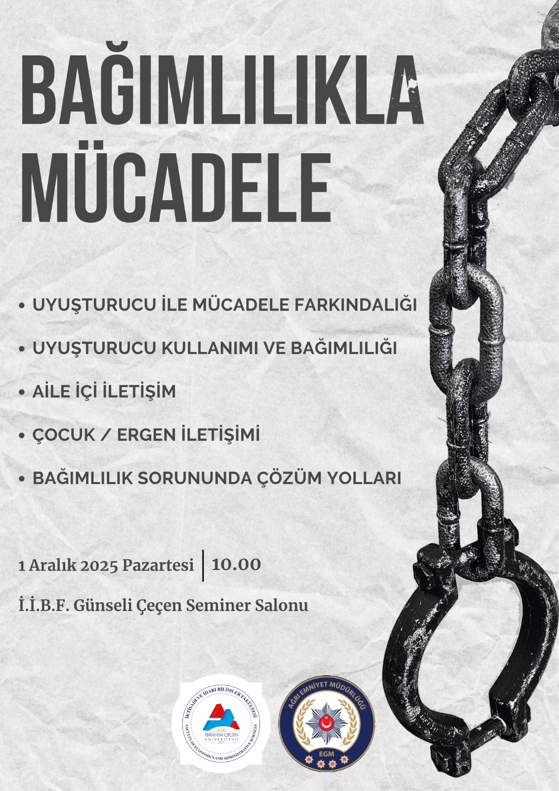 Fakültemizde "Bağımlılıkla Mücadele" semineri düzenlenecektir. Seminere tüm öğrencilerimiz davetlidir.