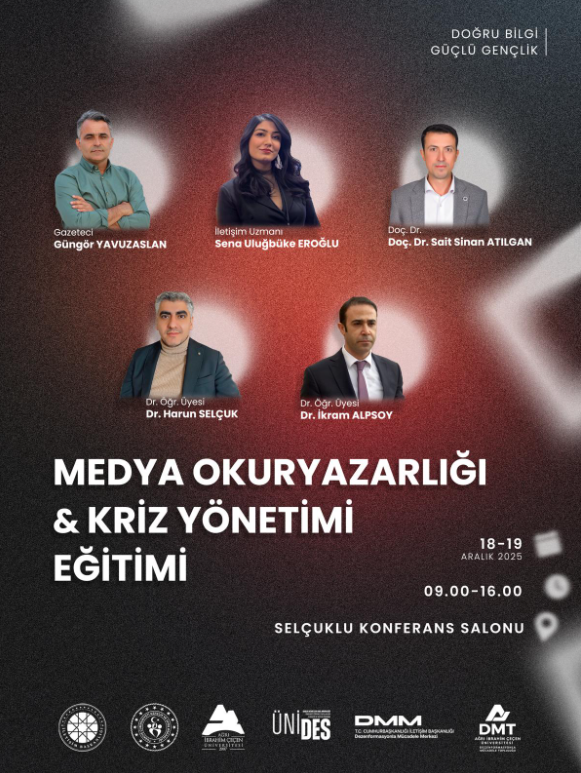 Fakültemiz Öğretim Üyelerinden Dr. Öğr. Üyesi İkram Alpsoy ile Dr. Öğr. Üyesi Harun SELÇUK hocalarımızın yer aldığı “Medya Okuryazarlığı ve Kriz Yönetimi” eğitimine tüm öğrencilerimiz davetlidir !