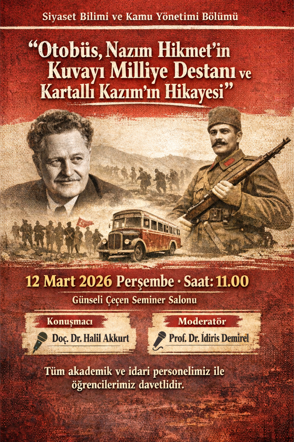 Siyaset Bilimi ve Kamu Yönetimi Bölümümüz tarafından düzenlenen “Otobüs, Nazım Hikmet'in Kuvayı Milliye Destanı ve Kartallı Kazım'ın Hikayesi” başlıklı akademik ve kültürel etkinlik, 12 Mart 2026 Perşembe günü saat 11.00’de Fakültemiz Günseli Çeçen Seminer Salonu’nda gerçekleştirilecektir.