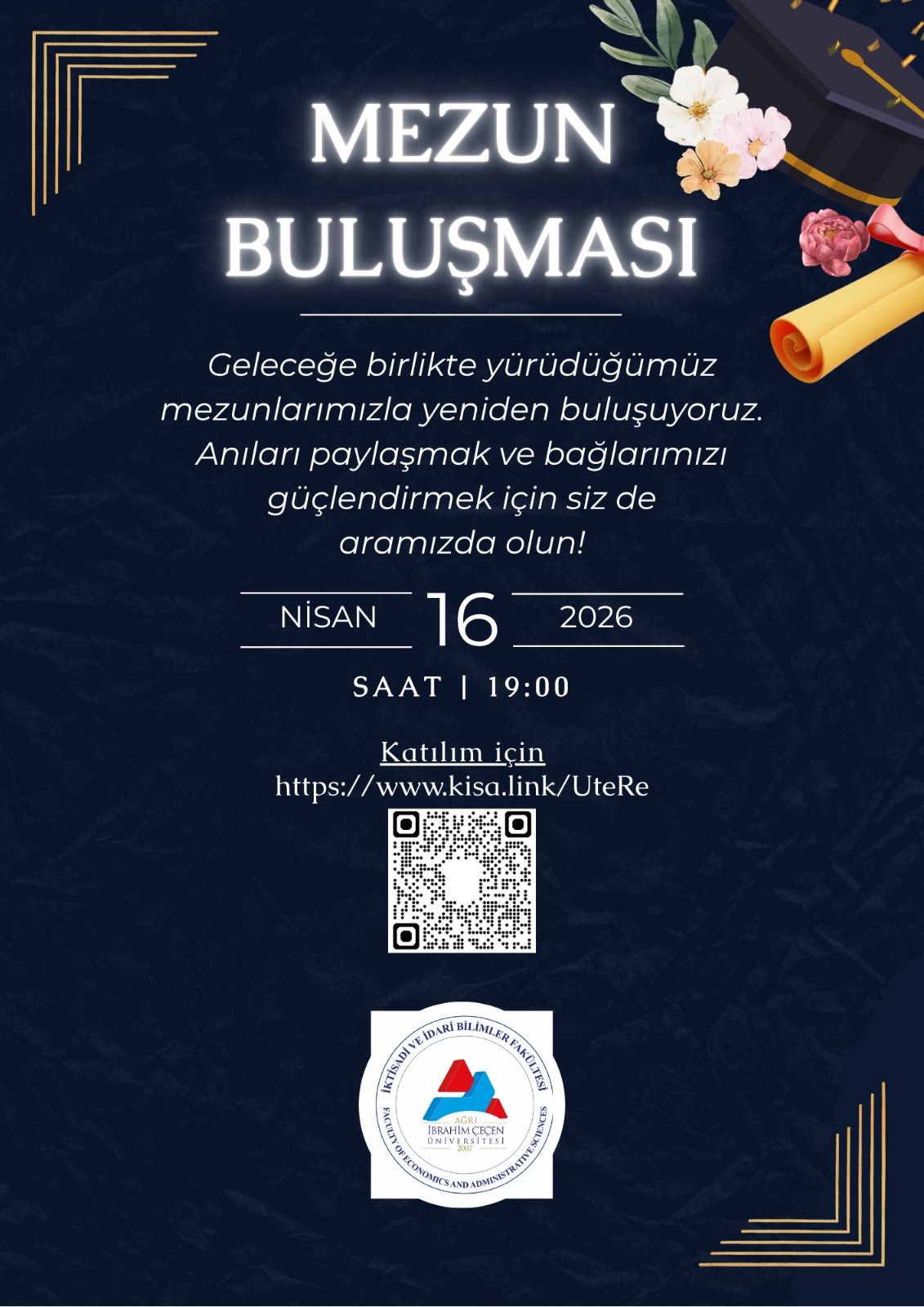 Mezunlarımızla bağlarımızı güçlendirmek ve deneyim paylaşımını artırmak amacıyla 16 Nisan 2026 Perşembe günü saat 19.00’da çevrim içi Mezun Buluşması programı gerçekleştirilecektir.