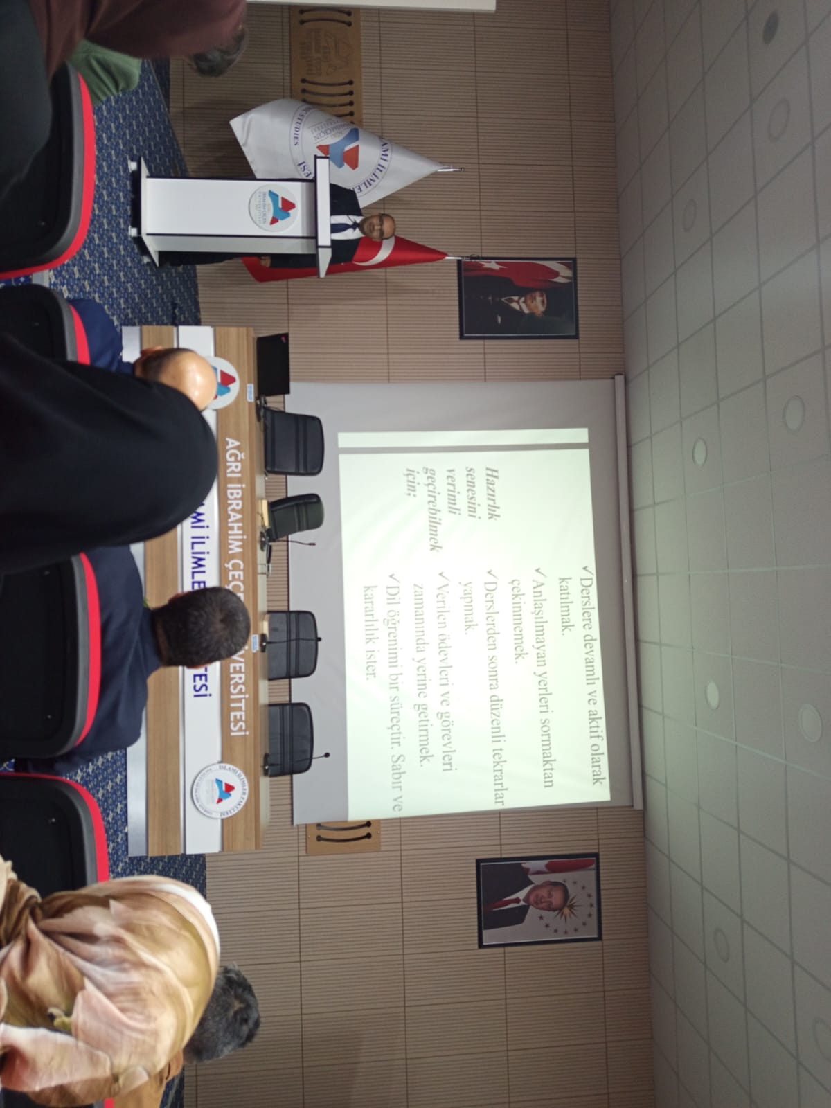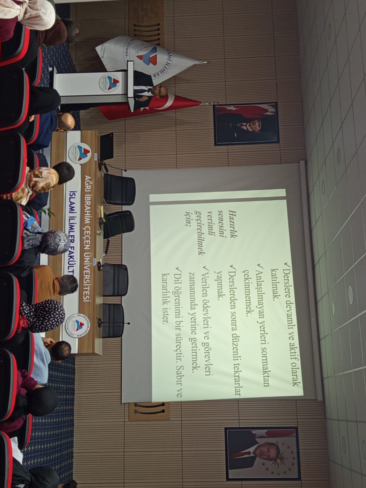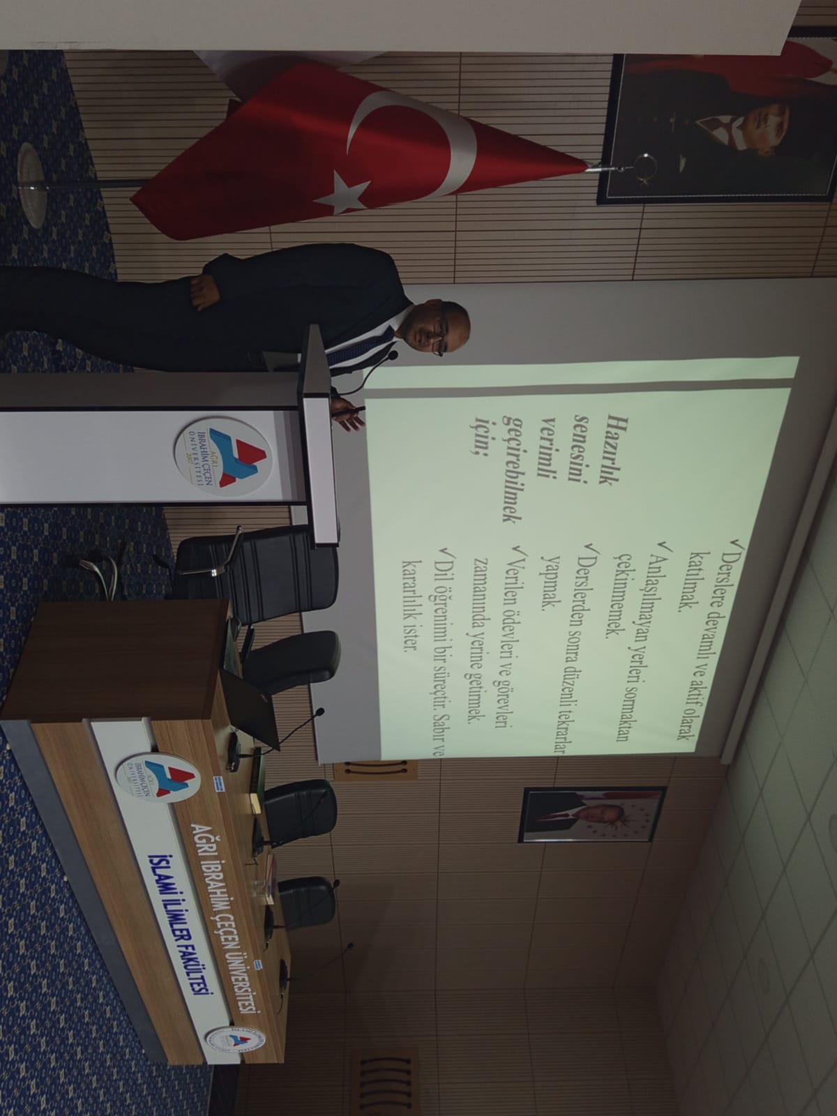 Birinci sınıf öğrencilerimizden Berat OĞUR’un Kur’ân-ı Kerîm tilâvetiyle başlayan programımızın açılış konuşmasını Dekanımız Prof. Dr. Mehmet Salih GECİT gerçekleştirdi. Dekanımız, konuşmalarında fakültemizin genel iş ve işleyişinden bahsedip İslami İlimler Fakültesi öğrencilerinden sahip olmalarını beklediği bazı temel niteliklere değindi. Müteakiben selâmlama konuşmasını gerçekleştiren Arap Dili ve Belâgatı Anabilim Dalı Başkanımız Dr. Öğr. Üyesi Mesut IŞIK, zorunlu Arapça hazırlık senesinin öneminden bahsedip Hazırlık sınıflarına ilişkin genel prosedürlere kısaca değindi. Ardından Arap Dili ve Belâgatı Anabilim Dalı hocalarımızdan Arş. Gör. Fatma AKPINAR, üniversitemizin ve fakültemizin tanıtımına ve hazırlık öğrencilerimizin Arapça eğitimlerinde kendilerine faydalı olacak temel bilgilere yönelik sunumunu gerçekleştirdi. Daha sonra Arap Dili ve Belâgatı Anabilim Dalı hocalarımızdan Arş. Gör. Hamza CİVELEK, “hazırlık sınıfı iş ve işleyişi” temalı sunumunu icra ederek hazırlık senesinin nasıl daha verimli geçirilebileceğinden ve hazırlık sınıfını geçme ve derslere devam kriterlerinden bahsetti.