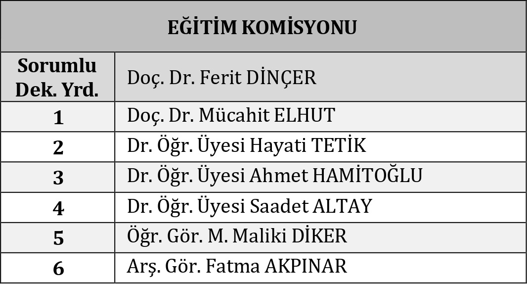 Madde 5: (1) Eğitim Komisyonu; Dekan veya Dekan tarafından görevlendirilen sorumlu Dekan Yardımcısı ile her bölümden üç adet öğretim elemanı, bir adet kayıtlı öğrenci ve bir adet mezun öğrenci olacak şekilde Dekanlık tarafından belirlenen toplam 21 üyeden oluşur. Komisyon üyeleri, Dekanlık tarafından belirlenirken; Komisyon üyeleri, fakültenin internet sayfasında ilan edilir,