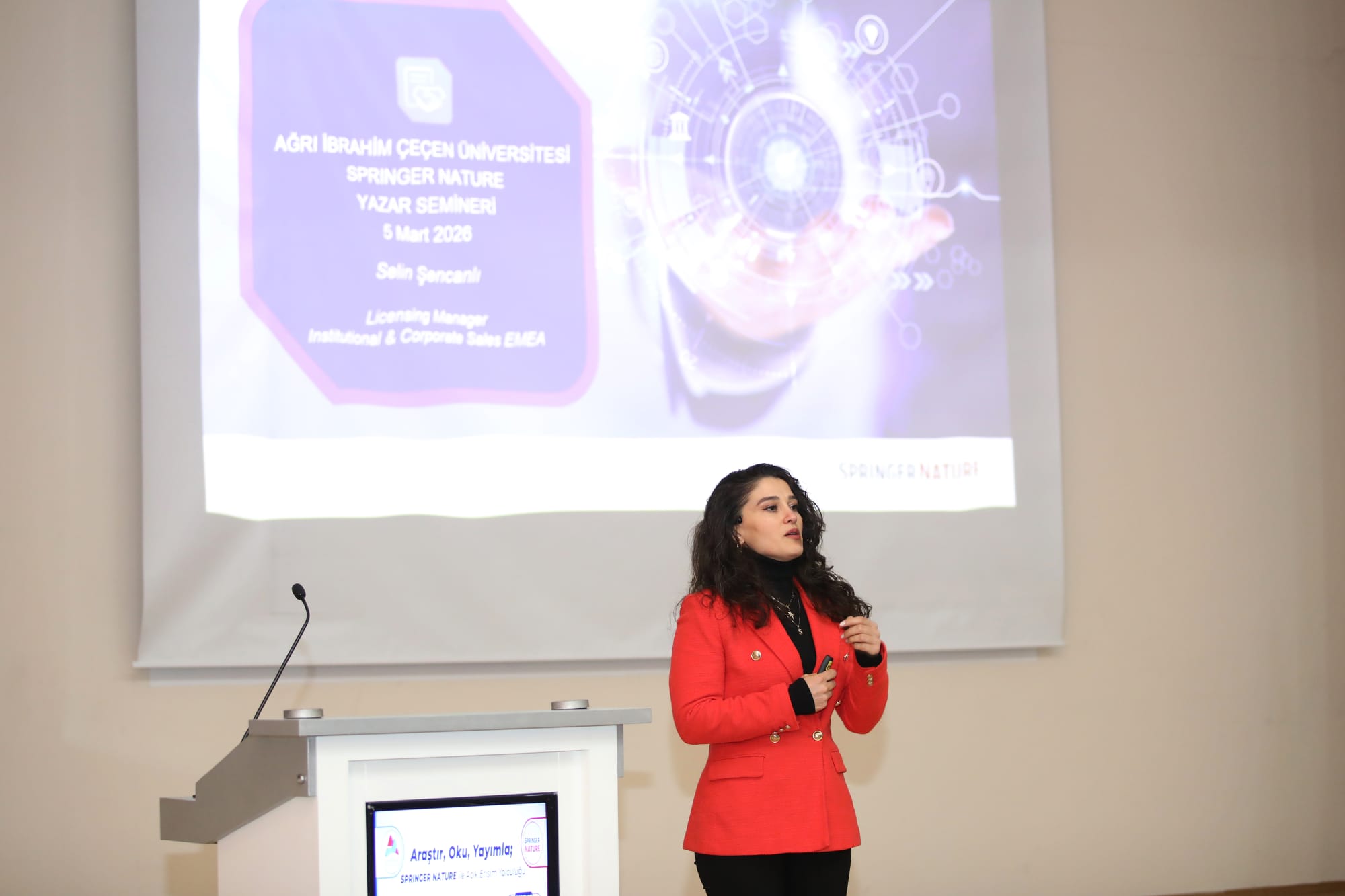 Üniversitemizde, araştırmacıların uluslararası akademik yayın süreçlerine dair bilgi edinmelerini sağlamak amacıyla "Springer Nature Yazar Semineri: Yayin Şansınızı Nasıl Artırırsiniz?" başlıklı seminer 5 Mart Perşembe 2026 tarihinde gerçekleştirildi.