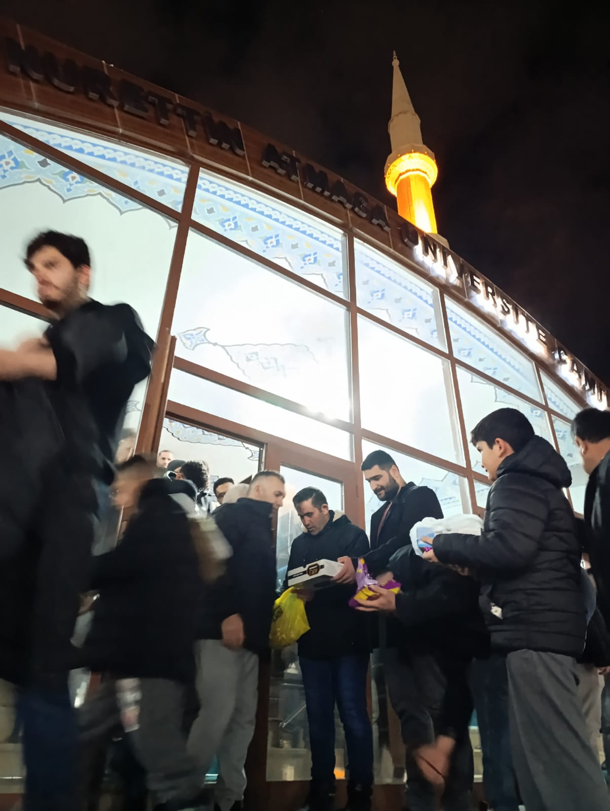 Ağrı İbrahim Çeçen Üniversitesi Beslenme ve Diyetetik Kulübü, bin aydan daha hayırlı olan Kadir Gecesi'nde anlamlı bir etkinliğe imza attı. Kulüp üyesi öğrenciler, Nurettin Atmaca Üniversite Camii'nde teravih namazı çıkışında cemaate çeşitli ikramlarda bulundu. Üniversitemiz Rektörü Prof. Dr. İlhami GÜLÇİN de bu anlamlı gecede öğrencileri yalnız bırakmayarak cami çıkışında öğrencilerle bir süre sohbet etti ve hatıra fotoğrafı çektirdi. Paylaşma ve yardımlaşma duygularının en üst seviyede yaşandığı bu mübarek gecede gerçekleştirilen etkinlik, hem öğrencilerin motivasyonunu artırdı hem de kulübün sosyal sorumluluk bilincini ortaya koydu.
