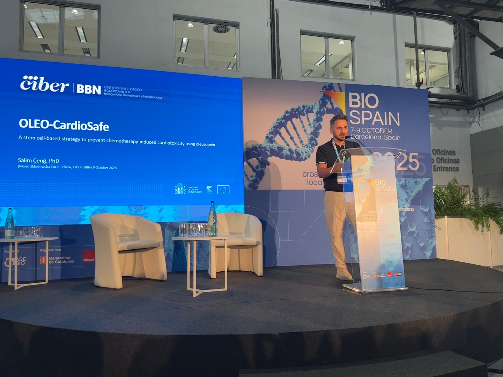 Avrupa Birliği Marie Skłodowska-Curie COFUND (ARISTOS) Doktora Sonrası Burs Programı kapsamında desteklenen ve 2025 yılı Eylül ayında İspanya’nın Barselona kentinde bulunan IDIBELL-CIBER-BBN (Centro de Investigación Biomédica en Red, Bioingeniería, Biomateriales y Nanomedicina) araştırma merkezinde çalışmalarına başlayan yüksekokulumuz öğretim üyesi Doç. Dr. Salim ÇERİĞ, Avrupa’nın en önemli biyoteknoloji buluşmalarından biri olan BIOSPAIN 2025’te (7–9 Ekim, Barselona) konuşmacı olarak yer aldı.