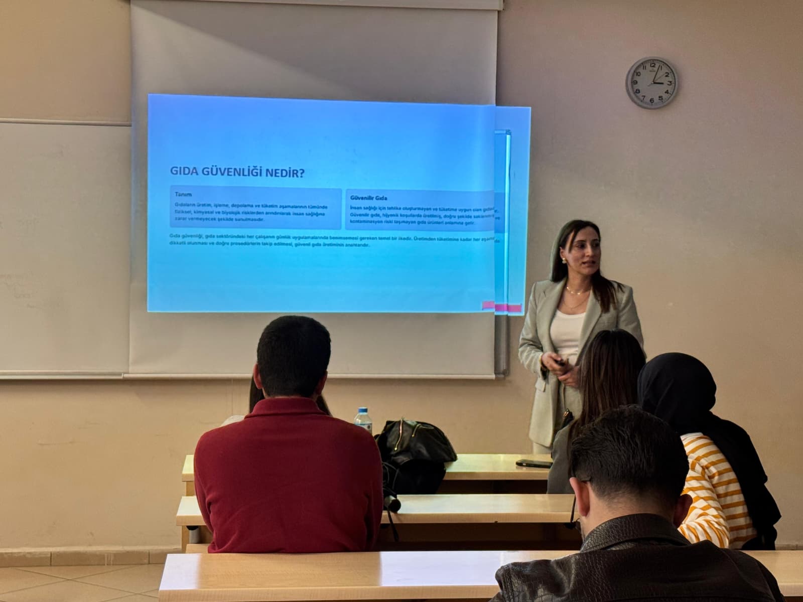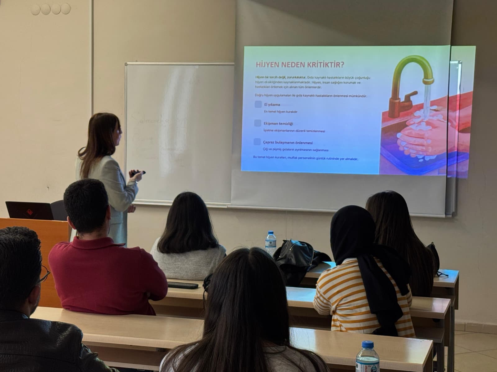 Sunum kapsamında öğrencilere, gıda güvenliği ve hijyeni ile mutfaklarda dikkat edilmesi gerekilen önemli konular hakkında detaylı bilgi aktarımı yapılmıştır.