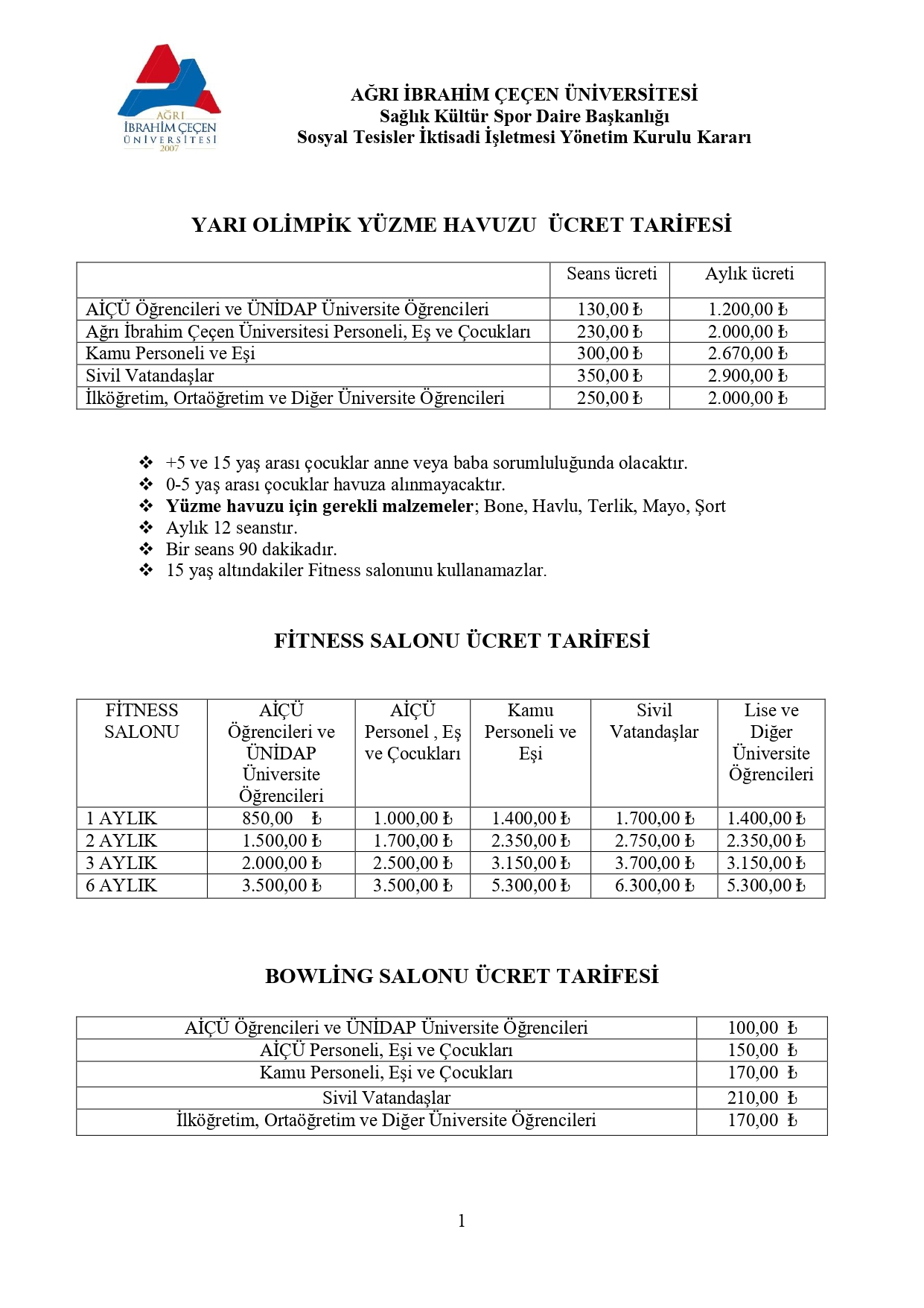 2026 Yılı Sportif Tesis Fiyatları Güncellendi