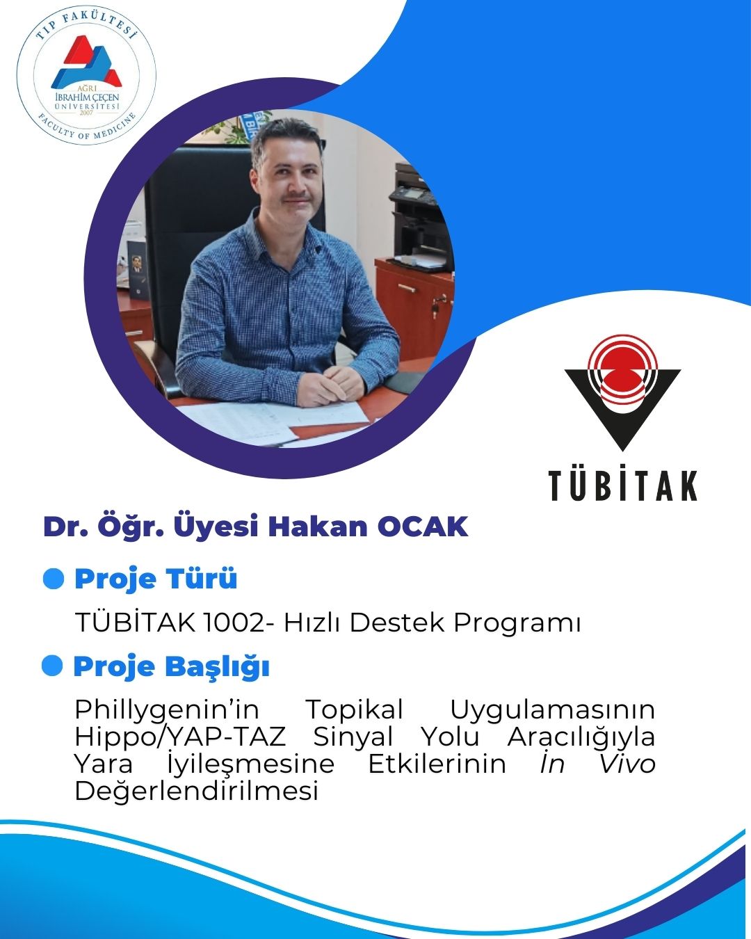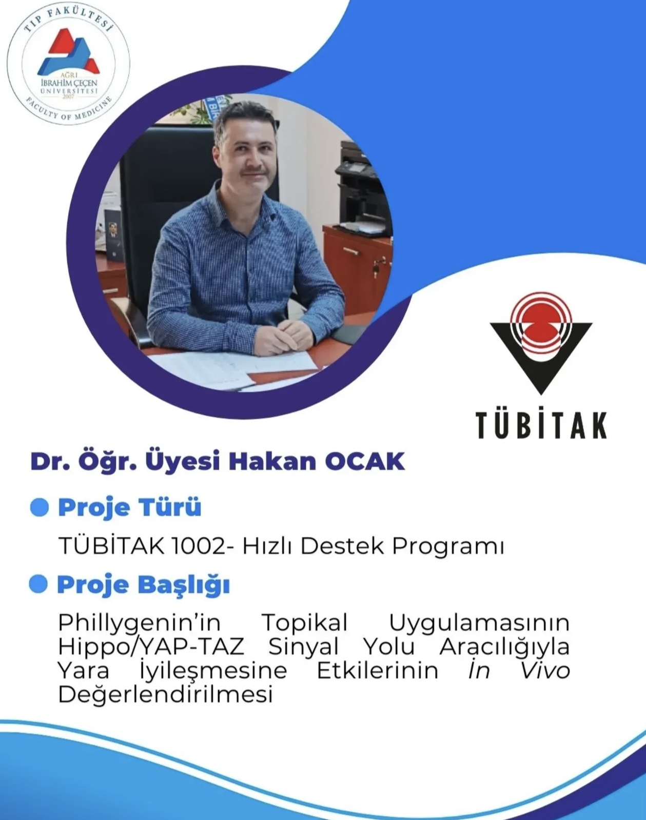 TÜBİTAK 1002 – Hızlı Destek Programı kapsamında, Fakültemiz Anatomi Ana Bilim Dalı öğretim üyelerinden Dr. Öğr. Üyesi Hakan Ocak’ın yürütücülüğünü üstlendiği “Phillygenin’in Topikal Uygulamasının Hippo/YAP-TAZ Sinyal Yolu Aracılığıyla Yara İyileşmesine Etkilerinin In Vivo Değerlendirilmesi” başlıklı proje kabul edilmiştir.