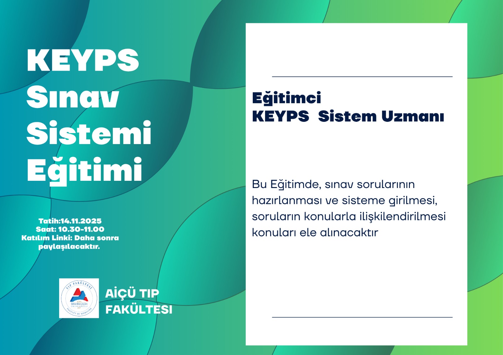 Ağrı İbrahim Çeçen Üniversitesi Tıp Fakültesi tarafından KEYPS Sınav Sistemi Eğitimi 14 Kasım 2025 düzenlenecektir. Eğitim, KEYPS Sistem Uzmanı tarafından verilecek olup; sınav sorularının hazırlanması, sisteme girilmesi ve soruların konularla ilişkilendirilmesi gibi konular ele alınacaktır. Katılım linki eğitim öncesinde paylaşılacaktır.