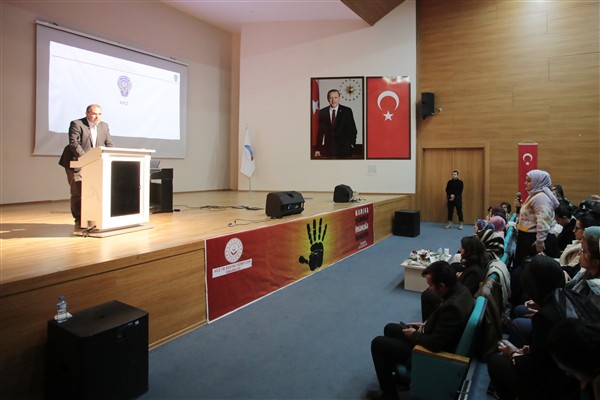 Konferansta, üniversitemiz Kadın Sorunları Uygulama ve Araştırma Merkezi Müdürü Doç. Dr. Gülpınar Aslan, Şiddet Önleme ve İzleme Merkezi Müdürü İhtidar Mercan, Aile İçi ve Kadına Şiddetle Mücadele Büro Amiri Komiser Aytekin Aldemir konuşmacı olarak yer aldı.