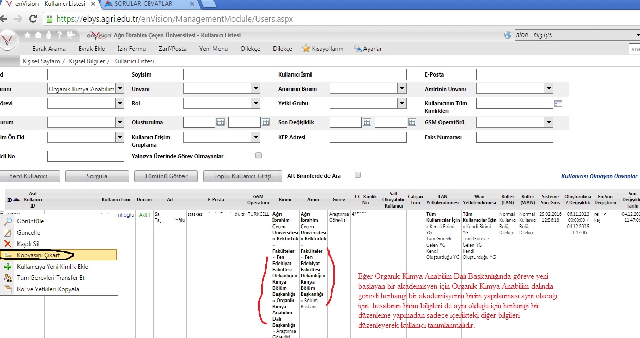 Örneğim Kimya Bölüm Başkanlığı altında yer alan Anabilim dalı Başkanlıklarına Organik Kimya Anabilim Dalı Başkanlığının kadrosuna atanmış bir akademisyen için kimlik oluşturulurken ilgili Anabilim Dalında hesabı olan bir kullanıcıdan Kopya Oluşturup içerik bilgilerini düzenleyerek yada yeni kullanıcı şeklinde tüm bilgileri sıfırdan giriş yaparak sisteme tanımlayabiliriz.