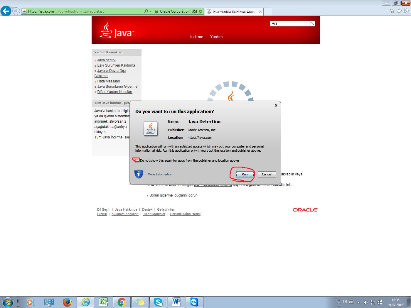 NOT: Google Crome Java desteğini kaldırdığıdan dolayı java doğrulama işlemini internet explorer üzerinden yapmalısınız?
