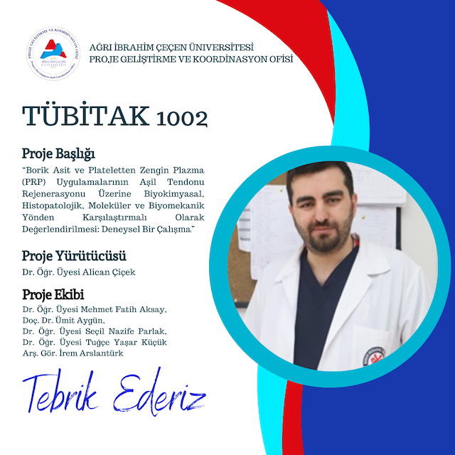 Tıp Fakültesinden Dr. Öğr. Üyesi Alican Çiçek’in yürütücüsü “Borik Asit ve Plateletten Zengin Plazma (PRP) Uygulamalarının Aşil Tendonu Rejenerasyonu Üzerine Biyokimyasal, Histopatolojik, Moleküler ve Biyomekanik Yönden Karşılaştırmalı Olarak Değerlendirilmesi: Deneysel Bir Çalışma” başlıklı proje TÜBİTAK 1002 programı kapsamında edildi.