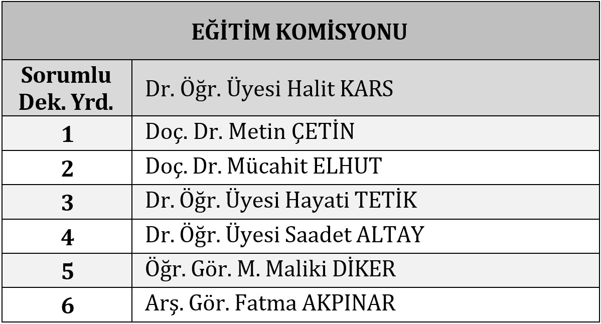 Madde 5: (1) Eğitim Komisyonu; Dekan veya Dekan tarafından görevlendirilen sorumlu Dekan Yardımcısı ile her bölümden üç adet öğretim elemanı, bir adet kayıtlı öğrenci ve bir adet mezun öğrenci olacak şekilde Dekanlık tarafından belirlenen toplam 21 üyeden oluşur. Komisyon üyeleri, Dekanlık tarafından belirlenirken; Komisyon üyeleri, fakültenin internet sayfasında ilan edilir,